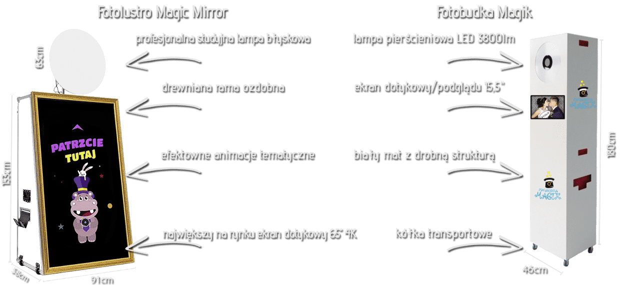 Klasyczne fotobudki cechuje elegancki design, szybkość i prostota w obsłudze. W połączeniu z naszymi nieszablonowymi gadżetami jest gwarancją udanej zabawy. Nasze fotolustro to stylowy następca fotobudki stylem przypominający atrakcję wprost z Hollywood! Największe na rynku 65 calowe lustro, na którym wyświetlane są wybrane fotobudkowe animacje, w połączeniu z czerwonym dywanem i ozdobnymi słupkami na pewno zrobi na Twoich gościach niezapomniane wrażenie!